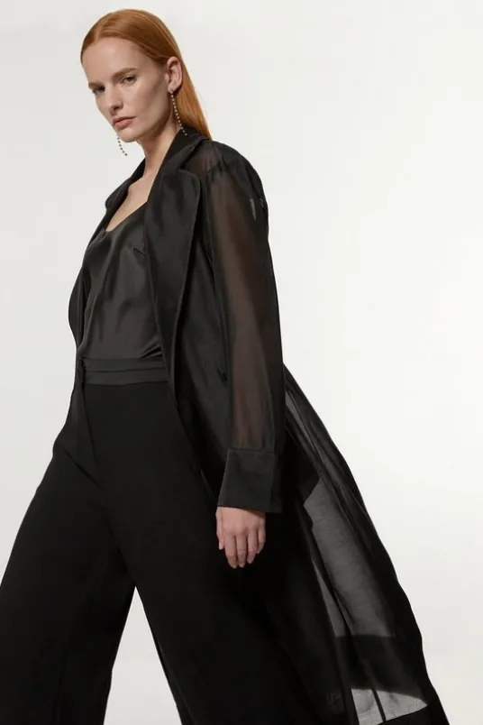 Organza And Satin Mix Tailored Sheer Trench Coat
