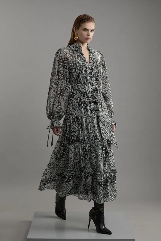 Paisley Crinkle Pleat Georgette Woven Midi Dress