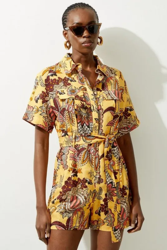 Bring in the summer with a playsuit, made in lightweight linen fabric, with a relaxed fit and a statement paisley print. It is adorned with detailed, in-house designed print work, and can easily be styled with a pair of sandals or heels.Paisley Viscose Linen Belted Woven PlaysuitHigh Quality Linen FabricComfortable Relaxed FitFlattering Belted WaistlineFun Paisley PrintButton Front FasteningPocket DetailingDetails & Care55% linen, 45% viscose. 30 degree synthetic cycle do not tumble dry, cool iron , do not dry clean. length measures 30cm