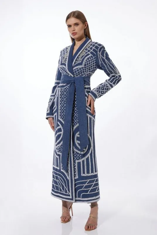 With a flowing fit that flatters the curves, as well as a belted waist that creates a cinched silhouette, and intricate beaded detailing, this denim dress is certain to turn heads. Style this piece with strappy heels for an occasion look perfect for parties and special events.Pearl Embellished Woven Denim Maxi Blazer Dress High Quality Denim Fabric Geometric, Beaded DetailingV NecklineBelted WaistlineLong SleevesStatement Maxi LengthDetails & Care84% Cotton 14% Polyester 2% Lycra. Lining: 94% Polyester 6% Lycra. Hand wash separately in cool water using non-biological liquid detergent. Do not dry clean. Model wears a UK 8/US Size 6. Centre back length of a 8: 140cm