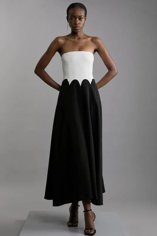 Be filled with confidence all night long in our petite bandeau dress, which features a universally flattering silhouette and a statement skirt. The fit and flare silhouette elevates the formality, while the scalloped detailing across across the waistline makes for a unique design that will catch eyes all night. Pair it with heels for a look perfect for party nights and special events.Petite Compact Stretch Colourblock Tailored Bandeau Midaxi DressHigh Quality Stretch FabricFlattering Fit and Flare SilhouetteStraight, Bandeau NecklineStatement Scalloped WaistlineExpertly designed for those 5’3″ and under, our Petite pieces are perfectly proportioned for a smaller frame using shorter lengths.Details & CareMain & Contrast: 96% Viscose/Rayon, 4% Elastane/Spandex. Lining: 100% Polyester. Dry clean only. Item length 125cm