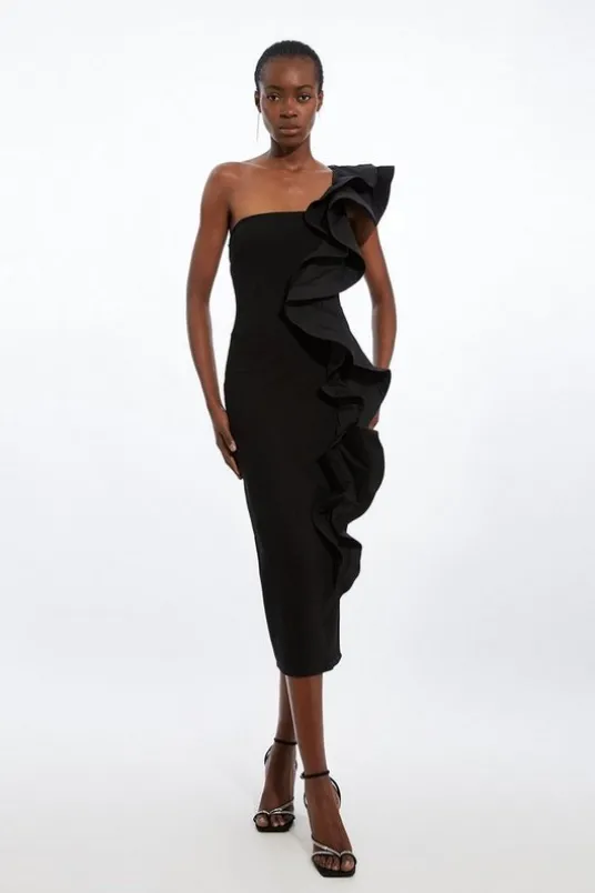 Experience elevated elegance in our petite midi dress, made with cotton fabric, featuring a silhouette that skims the cuves and a minimal design for ultra easy styling. The ruffle accent which cascades down the side brings a unique twist to the look, especially when matching with the one shoulder design. Style it simply with strappy heels or court heels for an elevated evening look.Petite Cotton Ponte Jersey Ruffle Detail Midi DressHigh Quality Cotton Jersey FabricFlattering Figure Hugging SilhouetteSleek, Minimal DesignUnique Ruffle Accent Down SideAsymmetric, One Shoulder DesignExpertly designed for those 5’3″ and under, our Petite pieces are perfectly proportioned for a smaller frame using shorter lengths.Details & Care68% Viscose/Rayon 28% Polyamide 4% Elastane/Spandex. Main & Contrast: 100% Cotton. Cool hand wash only. Do not dry clean.