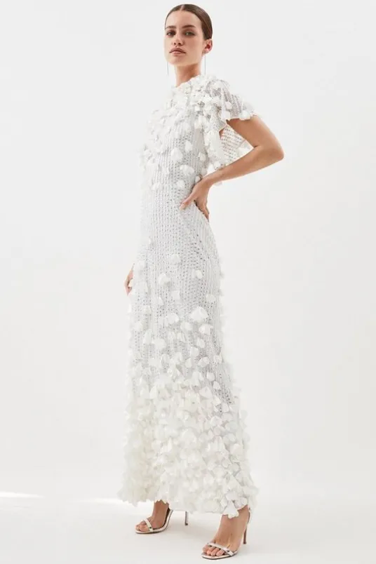 The ultimate feminine show-stopper, this maxi dress combines petal-like applique details with all-over crystal embellishments. Defined by ethereal angel wings, this dress exudes undeniable elegance and glamour. Complete the look with metallic heels.Floral applique detailsCrystal embellishmentsAngel sleevesMaxi hemlineExpertly designed for those 5’3″ and under, our Petite pieces are perfectly proportioned for a smaller frame using shorter lengths.Details & Care100% polyester. Gentle machine wash at 30 with similar colours. Model Height 5”10 – Model wears a UK 8/US Size 6. Centre back length of a 10: 125cm