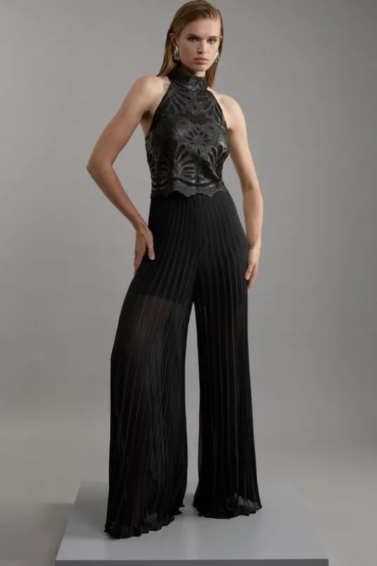Petite Cutwork Halter Neck Pleated Wide Leg Jumpsuit