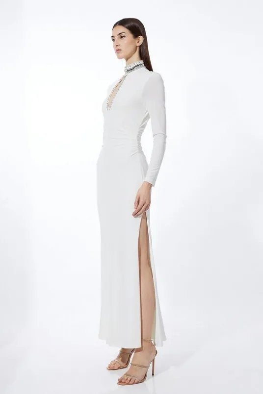 Exude a romantic and feminine mood in this maxi dress. Crafted from jersey crepe that sculpts the silhouette with lightly ruched texture, while crystal embellishments adorn a high neck and keyhole cut out for a luxury finish.EmbellishedLong sleevesKeyhole cut outDetails & CareMain: 95% Polyester 5% Elastane/Polyester. Lining: 95% Polyester 5% Elastane/Polyester. Hand wash separately in cool water. Model wears a UK S. Centre back length of a S: 130cm