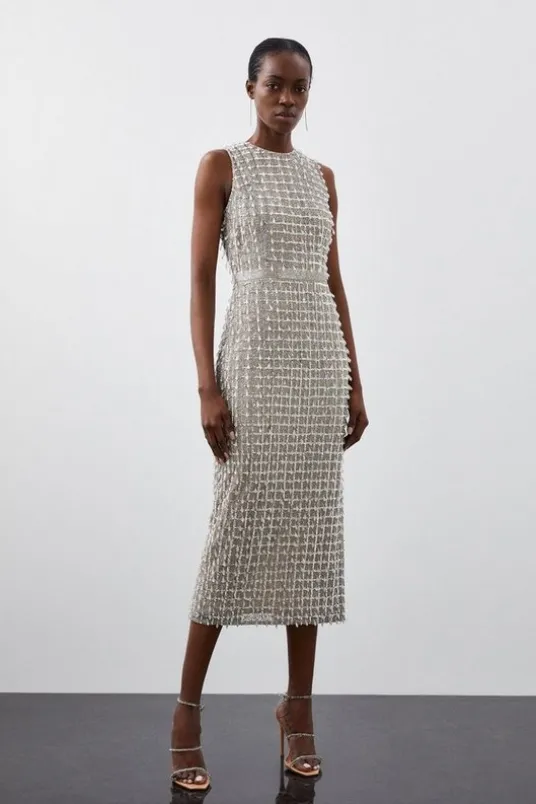 Add some sparkle in our petite midi dress, with sparkling crystal detailing entirely covering the dress, with teardrop detailing that moves with you, and a fit that flatters the curves. Style this piece with strappy heels for an outfit that goes seamlessly from party nights to wedding guest days.Petite Embellished Woven Midi DressStatement Crystal Embellished DetailingHigh NecklineFlattering, Figure Hugging FitUnique Teardrop EmbellishmentsBelted WaistlineThigh High Leg Split in BackZip Fastening in BackExpertly designed for those 5’3″ and under, our Petite pieces are perfectly proportioned for a smaller frame using shorter lengths.Details & CareShell: 100% Polyester. Lining: 100% Polyester. Beads: Glass.Hand wash separately in cool water using non-biological liquid detergent. Do not dry clean. Model wears a UK 8/US Size 6. Centre back length of a 8: 130cm