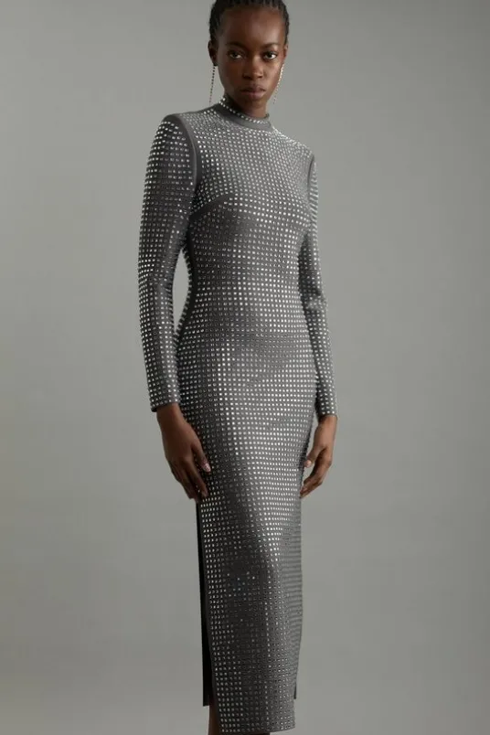Petite Figure Form Bandage Knit All Over Embellished Maxi Dress
