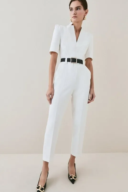 Look polished in a second thanks to this jumpsuit.. Designed to make you look pulled-together effortlessly, it features a V-neck front, notched collar, puffed shoulders, elbow-length sleeves and side pockets. Plus, with the buckled belt at the waist, it’ll create a forever-flattering silhouette.BeltedJumpsuitShort sleevesV-neckExpertly designed for those 5’3″ and under, our Petite pieces are perfectly proportioned for a smaller frame using shorter lengths.Details & CareMain: 63% Polyester, 32% Viscose, 5% Elastane. Lining: 100% Polyester. Dry clean only. Inside Leg Length in all sizes: 68cm. Model wears UK Size 8.