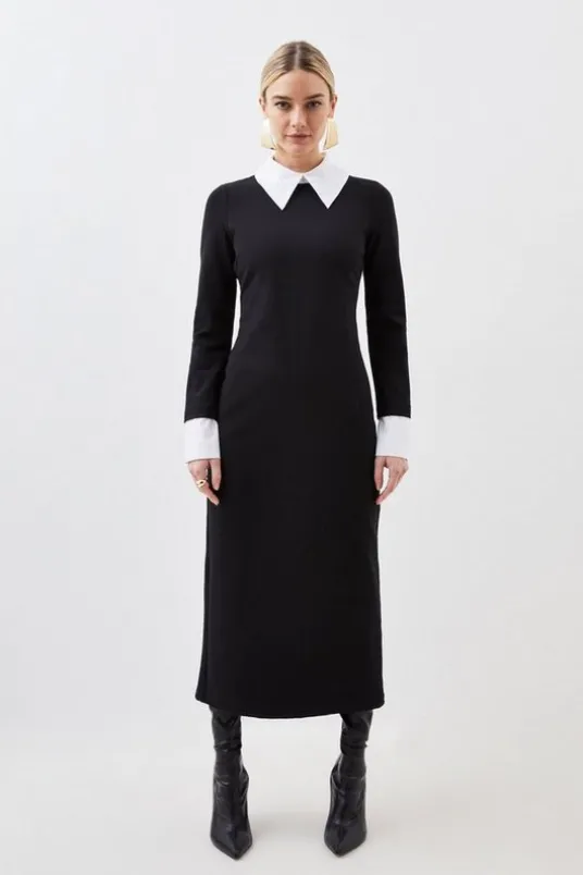 Defined by a large sharp collar, this sleek midi dress exudes a sophisticated mood. Long sleeves and a midi hemline create a streamlined silhouette, style this piece with court heels for a sharp and polished outfit.Collared neckMidi hemlineLong sleevesDetails & Care68% Viscose/Rayon 28% Polyamide 4% Elastane/Spandex. Main/Contrast: 60% Cotton 37% Polyamide 3% Elastane/Spandex.Gentle machine wash at 30 with similar colours. Wash inside out. Model wears a UK S. Centre back length of a S: 125cm