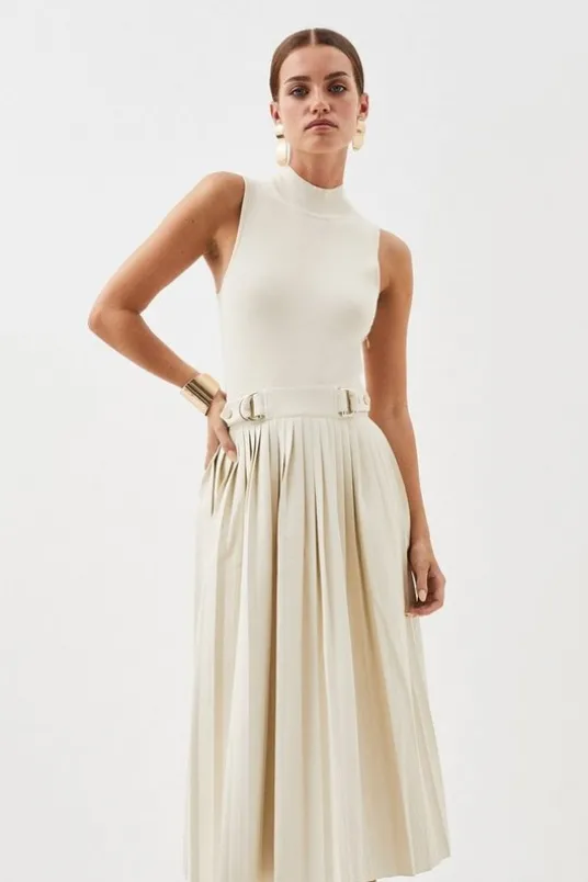 Offering an artful balance of elements, this midi dress has a sculpting jersey bodice that’s artfully contrasted by the cascading length of a pleating A-line skirt. This piece is detailed with military-inspired buckle tabs, calling for matching jewels to offset the harmonised ensemble.High neckKnitted bodiceBuckled side tabsPleated A-line skirtMidi lengthExpertly designed for those 5’3″ and under, our Petite pieces are perfectly proportioned for a smaller frame using shorter lengths.Details & Care59% Viscose, 41% Polyamide. Dry and store flat, Model wears a size petite small, Size small centre back length approx 125cm.