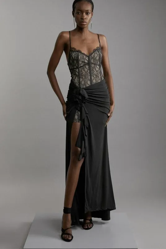 Elevate your occasion wear wardrobe with our petite maxi dress, with a figure hugging lace bodice and a draped jersey skirt overlay. The sweetheart backline and strappy back make for an elevated, statement occasion dress that is certain to turn heads. Style it with strappy heels for an occasion look that is guaranteed to turn heads wherever you step.Petite Lace And Jersey Crepe Maxi DressStatement Lace BodiceHigh Quality, Soft Jersey SkirtFigure Hugging FitFlared Midi SkirtFlattering Sweetheart NecklineRuched, Straight Hanging SkirtStrappy, Backless DesignCorset Style, Tie Back FasteningExpertly designed for those 5’3″ and under, our Petite pieces are perfectly proportioned for a smaller frame using shorter lengths.Details & CareMain 1: 84% Nylon. 16% Elastane/Spandex. Main 2: 95%Polyester. 5% Elastane/Spandex. Lining: 88% Nylon. 12% Elastane/Spandex. Wash inside out. Model wears Size Small.