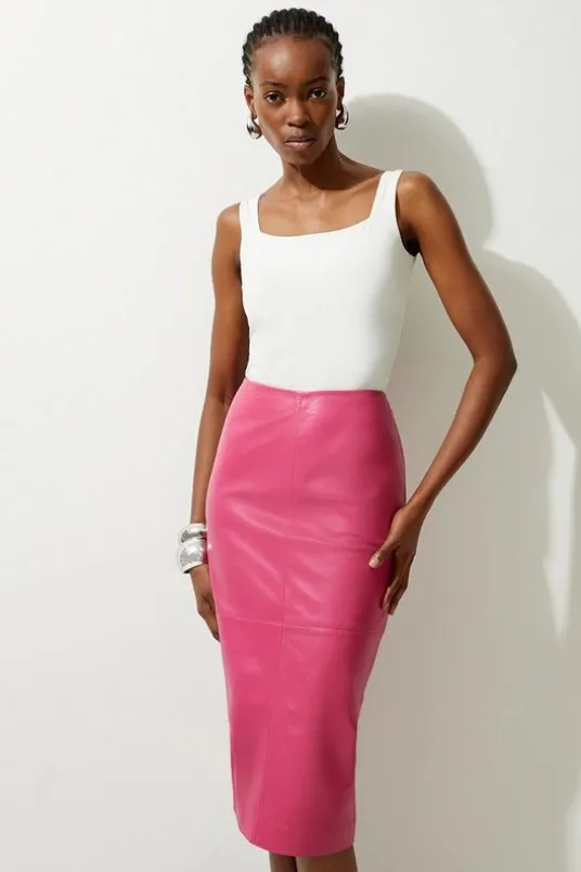 Experience updated wardrobe essentials with our petite midi skirt, made in supple leather, with a fitted silhouette and a high waistline, creating a universally flattering fit. Style this piece with anything, from a blouse and strappy heels, to a knit jumper, tights, and boots.Petite Leather Panel Pencil Midi SkirtHigh Quality, Soft Leather Sleek, Minimal DesignComfortable High WaistlineFlattering Figure Hugging SilhouetteMidi LengthPocket FeaturesZip Fastening in BackExpertly designed for those 5’3″ and under, our Petite pieces are perfectly proportioned for a smaller frame using shorter lengths.Details & Care100% Leather. Lining: 100% Polyester. Item length 79cm