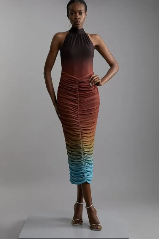 Elevate your occasion wear wardrobe with our petite midi dress, with a figure hugging fit and ruched detailing that flatters the curves, a high neckline to increase the formality, and a unique, ombre colourway. Style it with strappy heels for an occasion look that is guaranteed to turn heads wherever you step.Petite Ombre Jersey Mesh Halter Ruched Midi DressHigh Quality, Soft Jersey FabricFigure Hugging FitFlattering Ruched DetailingHigh, Halter NecklineStatement Ombre ColourwayButton Fastening Behind NeckExpertly designed for those 5’3″ and under, our Petite pieces are perfectly proportioned for a smaller frame using shorter lengths.Details & CareMain: 89% Polyester 11% Elastane/Spandex. Lining: 100% Polyester. Dry clean only. Model wears a Small