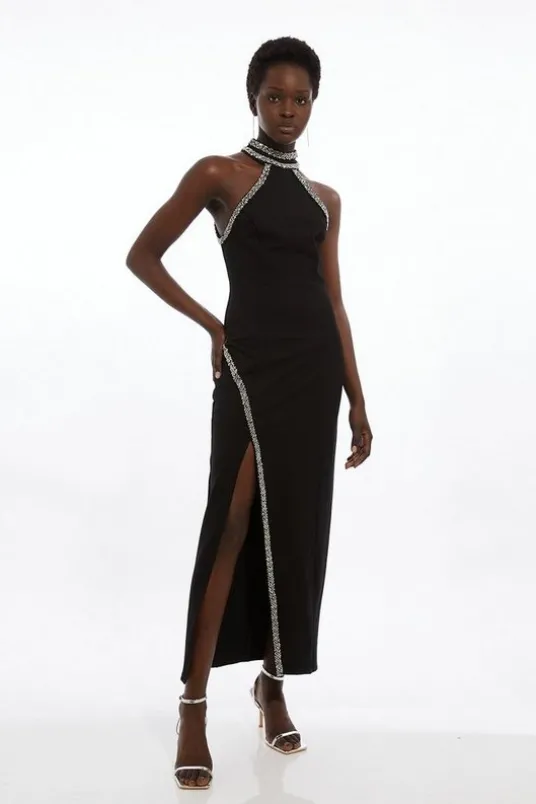 Master the art of party dressing in our petite midi dress. With beaded embellishments that create an opulent feel, crafted from a quality jersey that hugs the body, this piece contours the figure and is guaranteed to turn heads. Style with heels for an evening look to keep coming back to.Petite Premium Embellished Ponte Jersey Midi DressHigh Quality, Soft Jersey FabricBodycon Fit BodiceStraight Hanging SkirtSparkling Beaded EmbellishmentsDramatic Thigh High Leg SplitHalter NecklineZip Fastening in BackExpertly designed for those 5’3″ and under, our Petite pieces are perfectly proportioned for a smaller frame using shorter lengths.Details & CareMain: 68% Viscose/Rayon. 27% Polyamide. 5% Elastane/Spandex. Hand wash only.