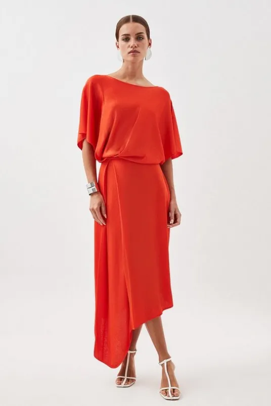 Draping with liquid elegance, this slinky-knit dress has a wide boat neck that structures the batwing silhouette with elegant aplomb. This style has a twisted waist that defines the form and creates soft gathers to the asymmetric high-low skirt.Boat neckBatwing sleevesTwisted waistAsymmetric hemExpertly designed for those 5’3″ and under, our Petite pieces are perfectly proportioned for a smaller frame using shorter lengths.Details & Care100% Viscose. Wash darks separately and dry flat. Model wears UK Petite Small. Small centre back length approx 135cm