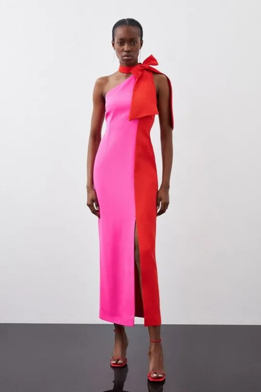 The statuesque column silhouette of this midi dress is punctuated by the feminine addition of a bow neckline, creating a scarf panel that drapes with languid elegance. This one-shoulder style has a slanted neckline, darting to the bodice, and a split side skirt that calls for a tonal stiletto to create a cohesive ensemble.One-shoulder bodiceTie neckColour blockMidi lengthExpertly designed for those 5’3″ and under, our Petite pieces are perfectly proportioned for a smaller frame using shorter lengths.Details & CareMain: 64% Polyester, 31% Viscose, 5% Elastane. Lining: 100% Polyester. Dry clean only. Model wears UK 8/US 4. Model height: 5″9. Item length 119cm