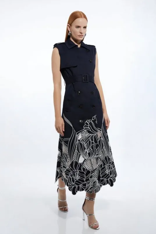 Petite Tailored Cotton Cutwork Embroidered Belted Trench Style Midaxi Dress