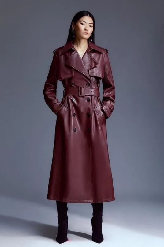 Petite Tailored Faux Leather Belted Trench Coat