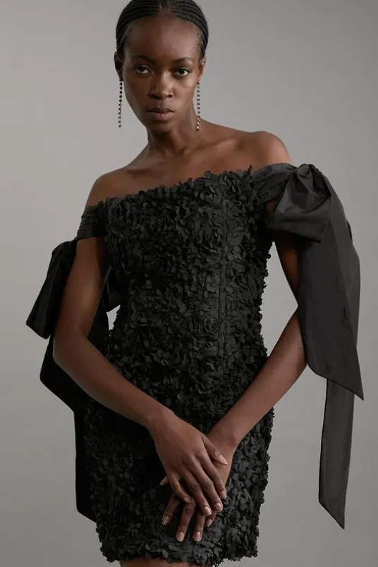 Make a statement no matter the occasion in our petite mini dress, which features a unique, textured fabric reminiscent of flower petals, as well as bardot sleeves made up of large bows. The figure hugging fit and mixed textures make for a dynamic, enticing piece that will be worn time and time again. Style this piece with strappy sandals or stilettos for an evening look perfect for date nights and parties.Petite Textured Rosette Bow Sleeve Mini DressHigh Quality, Textured Rosette FabricOff Shoulder, Bardot DesignEntirely Textured DetailingUnique Bow SleevesZip Back FasteningExpertly designed for those 5’3″ and under, our Petite pieces are perfectly proportioned for a smaller frame using shorter lengths.Details & CareMain: 100% Polyester. Contrast: 100% Polyester. Lining: 100% Polyester. Wash inside out. Model wears UK Size 10. Length measures 90cm.