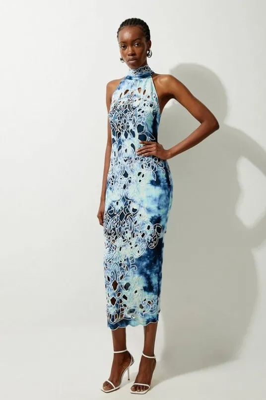 Petite Tie Dye Cutwork Twill Woven Halter Midi