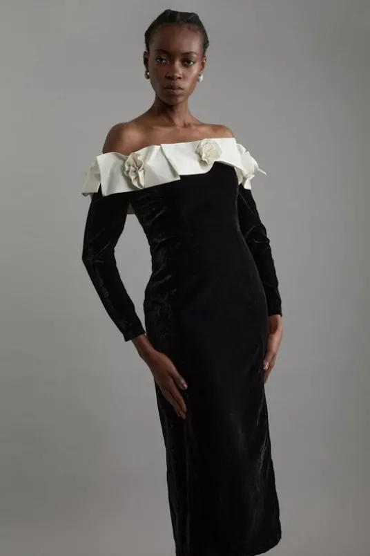 Petite Velvet Off The Shoulder Bodycon Woven Midi Dress With Taffeta Rosette