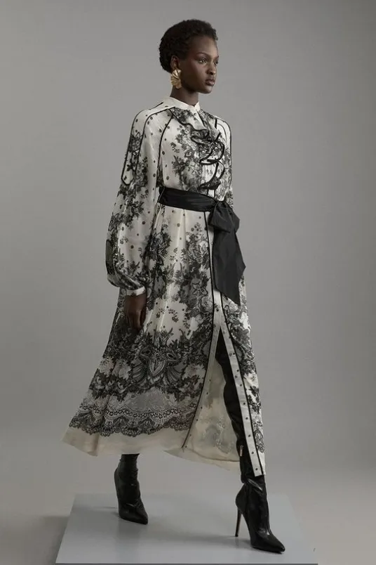 Step out in confidence in our petite midaxi dress, which is made with crinkled viscose fabric, and features a slouchy fit that skims the curves and long, balloon style sleeves. The bold, lace style print adds a feminine touch ideal for any occasion, and the ruffle elevates it even further. This dress can easily be paired with heeled boots or court heels for a day to night look.Petite Viscose Crinkle Placed Lace Printed Woven Midaxi DressHigh Quality, Textured, Viscose FabricComfortable, Relaxed Figure Skimming SilhouetteContrasting, Lace PrintLong Balloon SleevesFormal, High NecklineRuffle Accent at BustButton Front DetailingExpertly designed for those 5’3″ and under, our Petite pieces are perfectly proportioned for a smaller frame using shorter lengths.Details & CareMain: 100% Viscose/Rayon. Main & Contrast: 100% Polyester. Lining: 100% Polyester. Wash inside out. Model wears UK Size 10. Length measures 95cm.