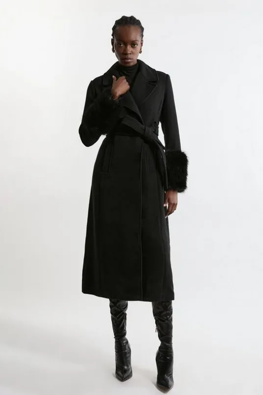 Luxurious wool blend fabric for warmth and comfortDetachable faux fur collar and cuffs for versatile stylingTailored fit with a belted waist for a flattering silhouetteFull-length design measuring 129cm for elegant coverageCollared neckline adds a sophisticated touchThis Karen Millen coat radiates sophistication and glamour, perfect for the discerning woman who appreciates expert craftsmanship. The tailored fit accentuates your figure, while the belted waist allows for customisable shaping. Versatility shines through with the detachable faux fur collar and cuffs, enabling you to transition from a classic look to a more opulent style. Pair with sleek knee-high boots and a clutch bag for formal events, or dress it down with tailored trousers and heeled ankle boots for a chic daytime ensemble. The full-length design ensures warmth and elegance, making it an ideal choice for winter weddings, race days, or any occasion where you want to make a polished statement. This coat is a testament to Karen Millen’s commitment to contemporary pieces that don’t compromise on quality or form.Expertly designed for those 5’3″ and under, our Petite pieces are perfectly proportioned for a smaller frame using shorter lengths.Details & CareShell 57% wool, 43% polyester. Faux fur trim 100% polyester. Lining 100% polyester. Do not bleach. Professional dry clean only. Item length 129cm.