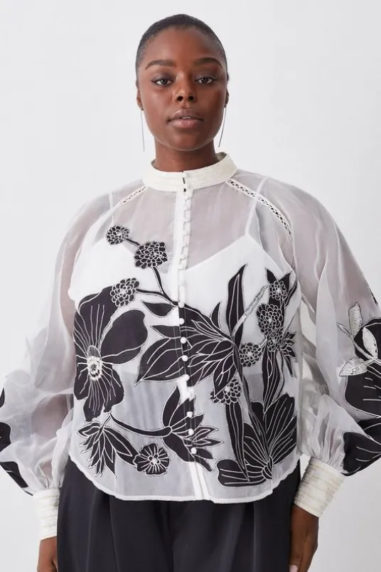 Abloom with metallic floral applique motifs, this opulent organdie design lends easy refinement every occasion. Detailed with neat fabric buttons, glimmering sequins, voluminous sleeves and shirred cuffs, this blouse makes an instant statement. Style with tailored pants and heels for a sophisticated ensemble.Floral applique detailsOrgandie designBalloon sleevesSequin embellishmentsSheer materialExpertly designed for those size 18 and above, our plus size clothing collection is perfectly proportioned to ensure you look fashionable at every shape.Details & Care100% polyester. Gentle machine wash at 30 with similar colours. Model Height 5”10 – Model wears a UK 18/US Size 16.