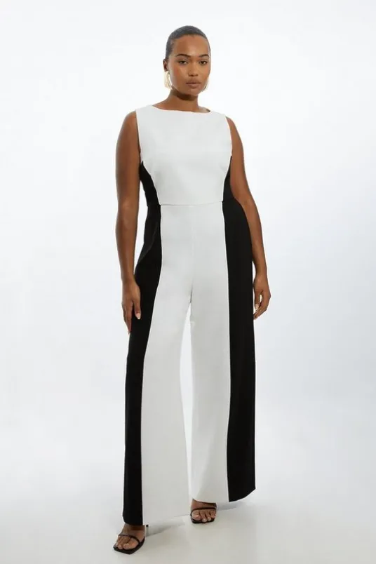Plus Size Compact Stretch Color Block Panelled Tailored Wide Leg Jumpsuit