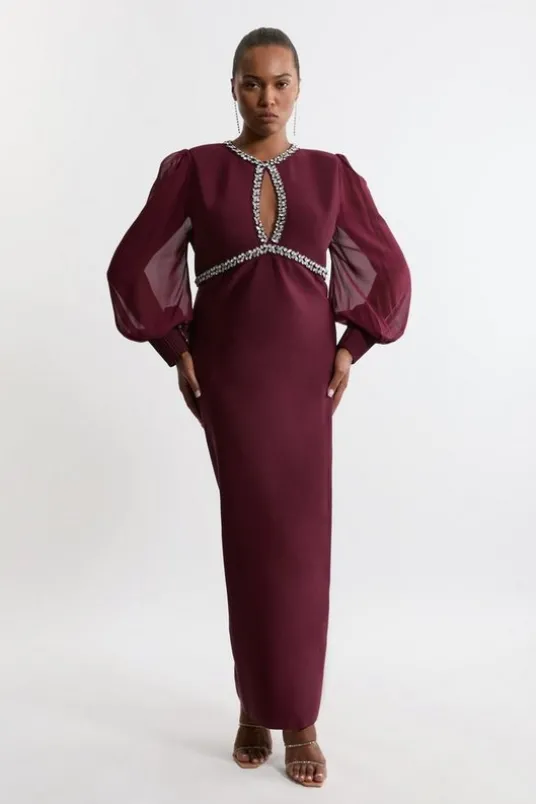 Experience elevated occasion wear in a plus size occasion dress, featuring a fit that skims the curves, and sheer, chiffon sleeves with a balloon cut for a playful edge. The embellished trims make this piece perfect for parties, so pair it with strappy heels for a look that takes you to all upcoming invites.Plus Size Embellished And Chiffon Sleeve Figure Form Knit Midaxi DressStatement, Floating Chiffon SleevesHigh NecklineEmbellished Trim Detailing Figure Hugging Bodice Straight Hanging SkirtPlayful Balloon SleevesStatement Cut Out at BustZip Back FasteningExpertly designed for those UK size 18/US size 14 and above, our plus size clothing collection is perfectly proportioned to ensure you look stylish at every shape.Details & Care97% recycled polyester, 3% elastane/spandex. do not wash, professional dry clean only. model wears a xl. models height 5″9. centre back length is 145cm