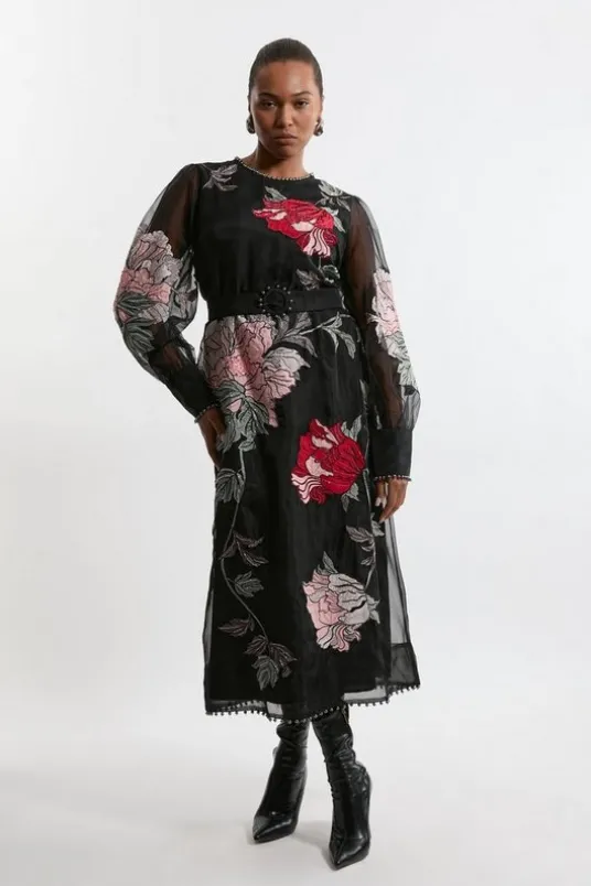 Feel confident in our plus size midi dress, with a formal, high neckline, as well as a floral design with shimmering beads. Style it with block heels or ankle boots for a look perfect for office days, then wear it with heeled boots or strappy heels for an evening look.Plus Size Embroidered Organdie Beaded Woven Balloon Sleeve DressTextured Organdie FabricFlattering Fit and Flare SilhouetteFormal, High NecklineFeminine Floral PrintIntricately Detailed BeadingFlared SkirtLong, Balloon SleevesExpertly designed for those UK size 18/US size 14 and above, our plus size clothing collection is perfectly proportioned to ensure you look stylish at every shape.Details & Care100% Polyester. Cool hand wash only. Do not tumble dry. Do not dry clean. Model wears size UK18. Length- 135cm