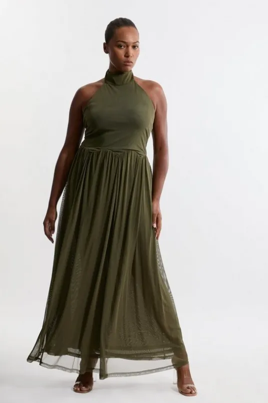 Plus Size Jersey Mesh Halterneck Maxi Dress