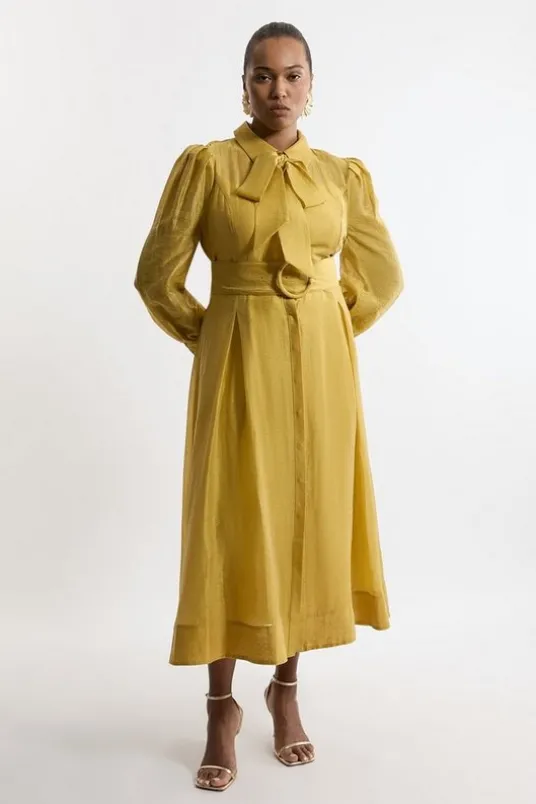 Elevate the everyday with this sophisticated pussybow dress. Crafted with a blend of linen and organdie, this dress has a lightweight and airy feel, perfect for the warmer seasons. The pussybow detail adds a timeless touch, while blouson sleeves and a belted waist create a flattering effect.Organdie and linen fabricLong sleevespussybow collarExpertly designed for those UK size 18/US size 14 and above, our plus size clothing collection is perfectly proportioned to ensure you look fashionable at every shape.Details & Care44% Linen 38% Lyocell 18% Polyamide. Lining; 97% Polyester 3% Elastane. Gentle machine wash at 30 with similar colours. Model wears a UK 18/US Size 16. Centre back length of a 18: 125cm. length approx 135cm