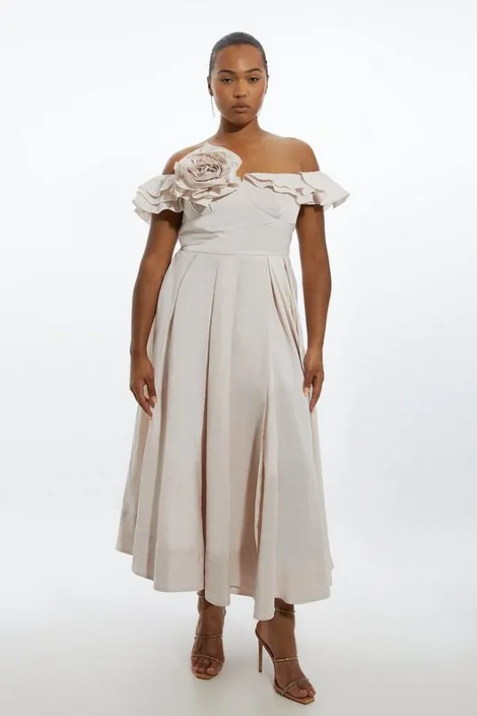 Make a statement in our plus size midi dress, made in floating taffeta, with a bardot neckline, floral detailing, and a dramatic fit and flare silhouette. Style this dress with strappy heels for an outfit that will turn heads from prom nights to upcoming occasions and events.Plus Size Off The Shoulder Taffeta Woven Maxi DressHigh Quality Taffeta FabricStatement Ruffles Across ShouldersThree Dimensional Flower AccentFlattering Fit and Flare SilhouetteVoluminous, Full SkirtMidi LengthZip Fastening in BackExpertly designed for those UK size 18/US size 14 and above, our plus size clothing collection is perfectly proportioned to ensure you look stylish at every shape.Details & Care100% polyesterGentle machine wash at 30 with similar colours. Model wears a UK 18.
