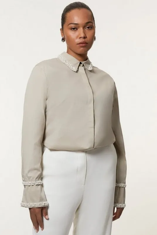 Feel confident in our plus size shirts, with a straight silhouette, and subtle pearl trims. Style it with tailored trousers and block heels or ankle boots for a look perfect for office days, then wear it with heeled boots or strappy heels for an evening look.Plus Size Pearl Trim Cotton Woven ShirtHigh Quality Cotton FabricFlattering Relaxed SilhouetteShimmering Pearl TrimsFormal, Collared NecklineExpertly designed for those UK size 18/US size 14 and above, our plus size clothing collection is perfectly proportioned to ensure you look stylish at every shape.Details & CareMain: 70% Cotton. 27% Polyamide. 3% Elastane/Spandex. Wash inside out. Model wears Size UK 18.