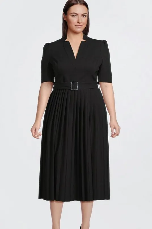Meet the everlasting style icon – the Forever Dress. A timeless addition to any well-considered wardrobe, this petite piece features a high notched collar, V-neck front, a fit and flare silhouette, and a belted waist. Feel elevated in our plus size midi dress, as the pleated skirt moves with you, and the structured shoulders bring the drama. Style it with heels or loafers for an elevated daytime look, perfect for year-round wear.Plus Size Tailored Structured Crepe Forever Pleat Midi DressHigh Quality Crepe FabricTextured, Pleated SkirtUnique Notched NecklineWrap Style BodiceStatement Structured ShouldersFlattering Flared SkirtBelted WaistbandMetallic Buckle DetailingZip Fastening in Back Expertly designed for those UK size 18/US size 14 and above, our plus size clothing collection is perfectly proportioned to ensure you look stylish at every shape.Details & CareMain: 62% Polyester, 34% Viscose/Rayon, 2% Elastane/Spandex. Lining: 100% Polyester. Dry clean only. Model Wears UK 18/ US 16 Length measurement: 130cm.