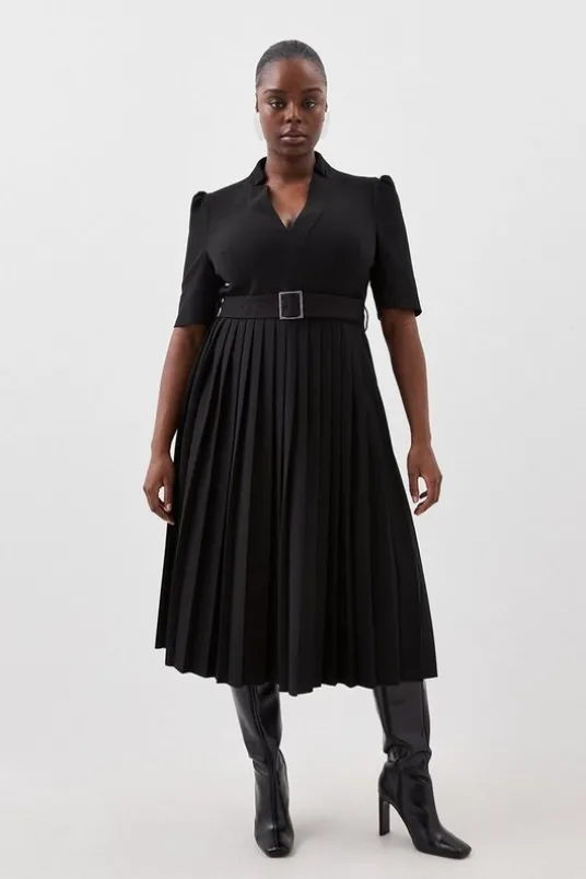 Called the Forever dress for a reason, this Structured Crepe midi style suits all kinds of special occasions. Designed to outlast trends and seasons, it shows off a notched neckline, elbow-length sleeves and pressed pleats. It buckles neatly at the waist with a matching fabric belt and makes a style-savvy choice for spring weddings, work days or balmy after-dark drinks.TailoredCrepePleatedNotched necklineExpertly designed for those UK size 18/US size 14 and above, our plus size clothing collection is perfectly proportioned to ensure you look fashionable at every shape.Details & CareMain: 30% Polyester, 32% Polyester, 34% Viscose, 4% Elastane. Lining: 100% Polyester. Dry Clean Only. Item length 115cm