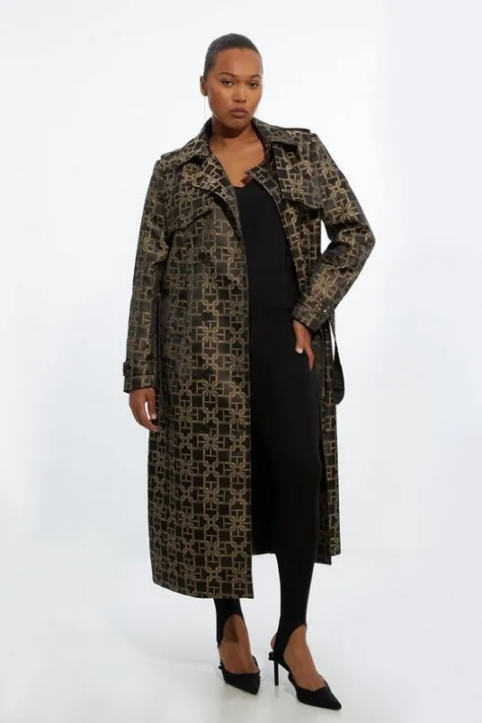 Maintain the formality even when it rains with our plus size trench coat, with a fit and flare silhouette, a belted waist for a flattering fit, and a midi length to protect from the elements. The geometric print makes a subtle statement, perfect for an outer layer that elevates any look. Wear it over any outfit, whether heading out for dinner or to the office.Plus Size Tailored Double Breasted Belted Trench CoatHigh Quality, Tailored Design Statement Geometric PrintFlattering Fit and Flare SilhouetteDouble Breasted ButtonsBelted Waist for a Cinched SilhouetteFormal Collar AccentPocket FeaturesExpertly designed for those UK size 18/US size 14 and above, our plus size clothing collection is perfectly proportioned to ensure you look stylish at every shape.Details & CareMain 100% Polyester. Lining 100% Polyester. Dry clean only. Model Height 5”10 – Model wears a UK 10/US Size 8. Length 132cm