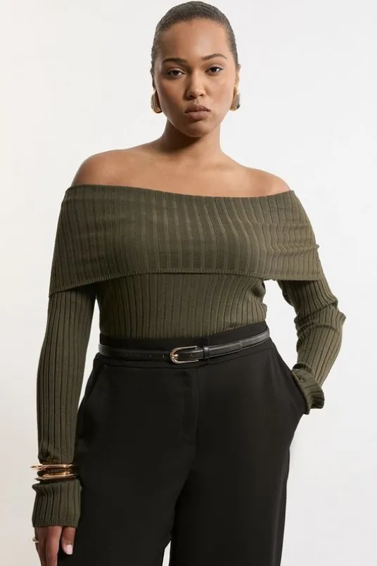 Elevate your every day wardrobe with a plus size knit jumper, which features a bodycon fit that highlights the curves, and a statement, foldover bardot neckline which elevates the formality. Style it with tailored trousers or jeans and strappy heels for a day to night look that is guaranteed to turn heads wherever you step.Plus Size Viscose Blend Bardot Knit JumperHigh Quality, Soft Knit FabricFormal Bardot NecklineFold Over AccentLong SleevesBodycon SilhouetteSubtle Stripe DetailingExpertly designed for those UK size 18/US size 14 and above, our plus size clothing collection is perfectly proportioned to ensure you look stylish at every shape.Details & Care70% viscose/rayon 30% Nylon. 30 degree wool cycle.. Model wears UK Plus XL