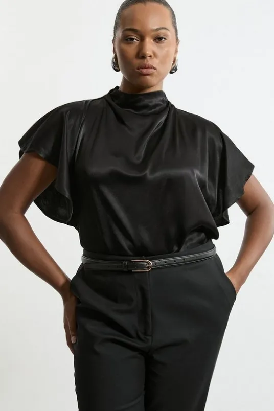 Elevate your top selection with our plus size satin blouse, with a relaxed fit, and a statement draped neckline. This piece pairs well with anything, from a flowing maxi skirt, to tailored trousers, to jeans for an elevated look that will take you seamlessly from day to night.Plus Size Viscose Satin High Neck Woven BlouseHigh Quality Satin FabricStatement Draped DesignRelaxed SilhouetteSleek, Minimal DesignHigh NecklineButton Fastening Behind NeckExpertly designed for those UK size 18/US size 14 and above, our plus size clothing collection is perfectly proportioned to ensure you look stylish at every shape.Details & Care100% visocse/rayon. Do not wash. Hand wash only. Model wears size UK 18/ USA 14. Length approx : 65cm