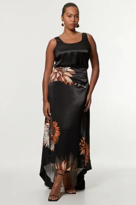 Plus Size Viscose Satin Printed Panelled Train Maxi Skirt