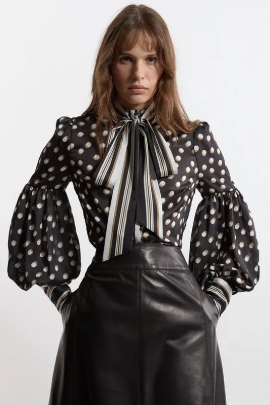 Feel day to night ready in our blouse, with a relaxed fit, a playful polka dot print, and long balloon sleeves. Style it with the tailored trousers or jeans and boots for a look ideal for going from the office to post work plans.Polka Dot Woven Balloon Sleeve BlouseComfortable, Relaxed FitLong Balloon SleevesHigh NecklineTie Neck AccentFun Polka Dot PrintDetails & CareMain: 100% Polyester. wash inside out. Model wears UK Size 10.