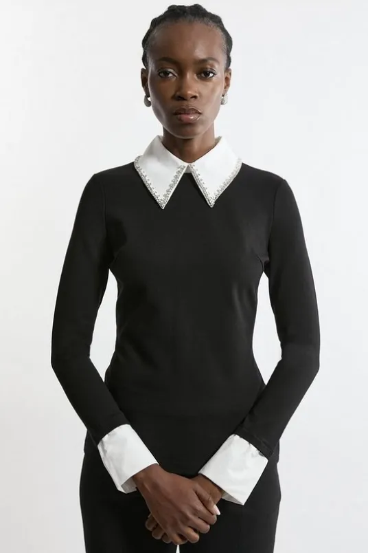 Get day to night ready in our collared top, made in soft ponte fabric, with a fitted silhouette, and contrasting detailing. Style it simply with tailored trousers and ankle boots or heels for a look that will take you from office days to evenings out.Ponte Embellished Contrast Collar Fitted TopHigh Quality Ponte FabricFlattering Fitted SilhouetteShirt Style Bodice with Button DetailingFormal Collar Accent Contrasting Collar and Cuffs Sparkling, Embellished Detailing Zip Back FasteningDetails & CareMain: 68% Viscose/Rayon. 28% Polyamide. 4% Elastane/Spandex. Main & Contrast: 60% Cotton. 37% Polyamide. 3% Elastane/Spandex. Wash inside out. Model wears Size S.