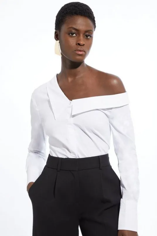 Elevate your evening looks in our top, with a comfortable, relaxed silhouette, an asymmetric collar, and off shoulder sleeves. Style it with tailored trousers or jeans and strappy heels for an elevated evening look, then with jeans and loafers for a more casual approach.Poplin Asymmetric Longline Woven ShirtHigh Quality Poplin FabricFlattering Relaxed SilhouetteUnique Asymmetric Neckline Off Shoulder Sleeves Button Front FasteningsDetails & Care85% Cotton, 35% Polyester. 30 degree synthetic cycle, wash with similar colours, wash inside out, iron on reverse, do not tumble dry or bleach. Model wears UK S.