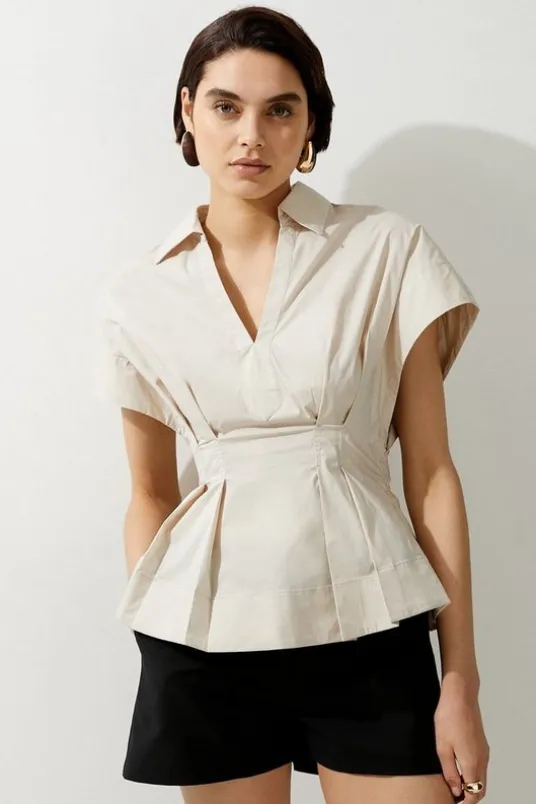 Feel formal in our shirt, made with high quality poplin fabric, featuring a cinched waist which flares at the hips, and wide, short sleeves. This piece can be easily paired with anything from tailored trousers to denim jeans for looks that go from office days to dinner dates.Poplin Balloon Strong Shoulder Woven ShirtHigh Quality Poplin FabricFlattering Cinched Silhouette Formal Collar Accent V NecklineCasual Short, Structured SleevesFlared Fit at the HipsDetails & Care65% cotton 35% polyester . Gentle machine wash at 30 with similar colours. Model wears a UK 10/ US size 8. length: 52cm