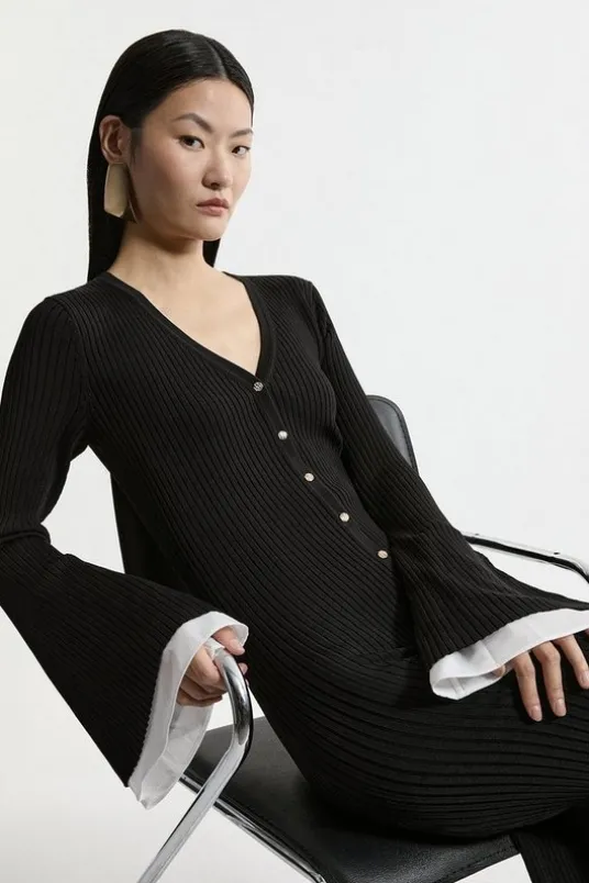 Elevate your every day wardrobe in our midi dress, with a silhouette that hugs the curves and flows to a straight hanging skirt, as well as deep V neckline, and button details. Style it with knee high boots for a day to night look.Premium Drape Rib Knit Woven Cuff Midi DressHigh Quality, Soft Knit FabricFlattering Fitted SilhouetteThigh High Leg SplitDeep V NecklineMetallic Button DetailingUnique, Flared SleevesDetails & Care75% viscose/rayon, 25% polyamide. 30 degrees wool cycle. model wears a Small. models height is 5″7. centre back length is 134cm.