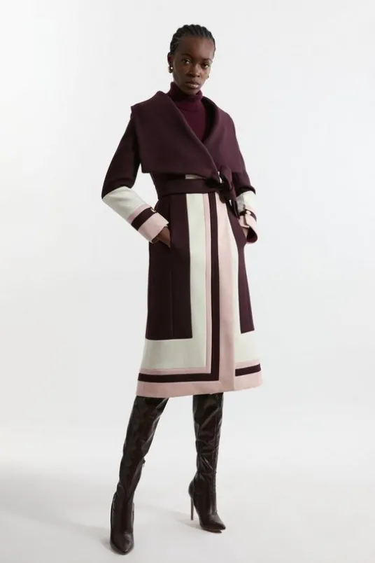 Premium Italian Manteco Wool Color Block Border Detail Tailored Wrap Midi Coat