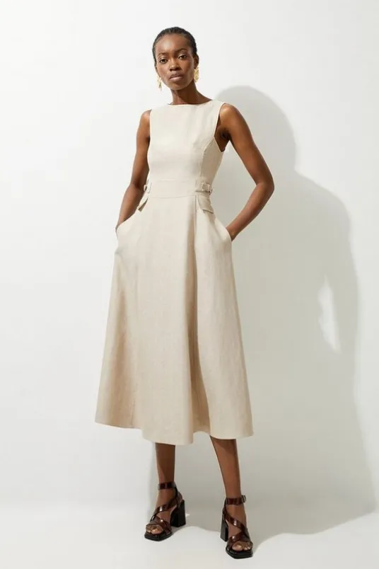 Experience everyday elegance in our midi dress, made with summer ready linen fabric, with a fit and flare silhouette and tab details designed to cinch the waist. Style it with sandals or court heels for a look that will take you from summer office days to date nights.Premium Linen Tab Waist Detail Full Skirt Tailored Midi DressHigh Quality Linen FabricFlattering Fitted BodiceDramatic Flared SkirtUnique Tab Accents on WaistPocket DetailingSleeveless DesignZip Fastening in BackDetails & CareMain: 47% Polyester 27% Linen 25% Viscose/Rayon 1% Elastane/Spandex. Lining: 100% Polyester. Dry clean only. Model wears UK Size 8/ US Size 4. Model height approx: 5″9. Length approx: 130cm