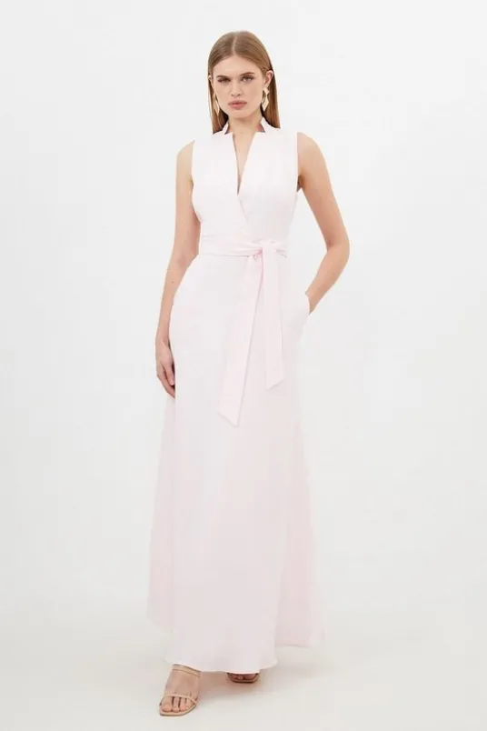 Expertly tailored with an elegant effect, this midaxi dress is crafted lightweight linen. Featuring a notched neckline, sleeveless design, and wrap dress effect while a self-tie belt cinches the waist for a flattering silhouette. Pair with barely-there heels for evening wear or sandals for daywear.LinenSleevelessBeltedMidaxi lengthDetails & CareMain: 50% Linen 50% Viscose/Rayon. Lining: 100% Polyester. Dry clean only. Model wears UK Size 8/ US Size 4. Model height approx: 5″9. Length approx: 142cm