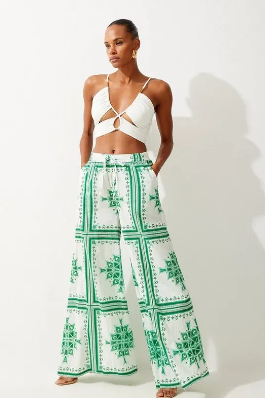 CLOTHINGPantsFlare PantsHamptons OutfitsNew SeasonVacation ShopBeach Cover UpsCottonBeach Vacation OutfitsSummer OutfitsNEW INLast Chance to BuyPrints4th July OutfitsFeel summer ready in a pair of beach trousers, with lightweight fabric perfect for sunny days, and a relaxed fit ideal for laidback days by the pool. The palm print makes a sunshine-approved statement, and they can easily be styled with the matching top and strappy sandals for a holiday outfit that goes seamlessly from day to night.Printed Cotton Voile Beach TrousersHigh Quality Cotton FabricStatement, Ultra Wide Leg FitComfortable High WaistlineFun Palm PrintDrawstring WaistbandMatching Top Sold SeparatelyDetails & Care100% Cotton. Wash separately. Model Height 5”10 – Model wears a S.